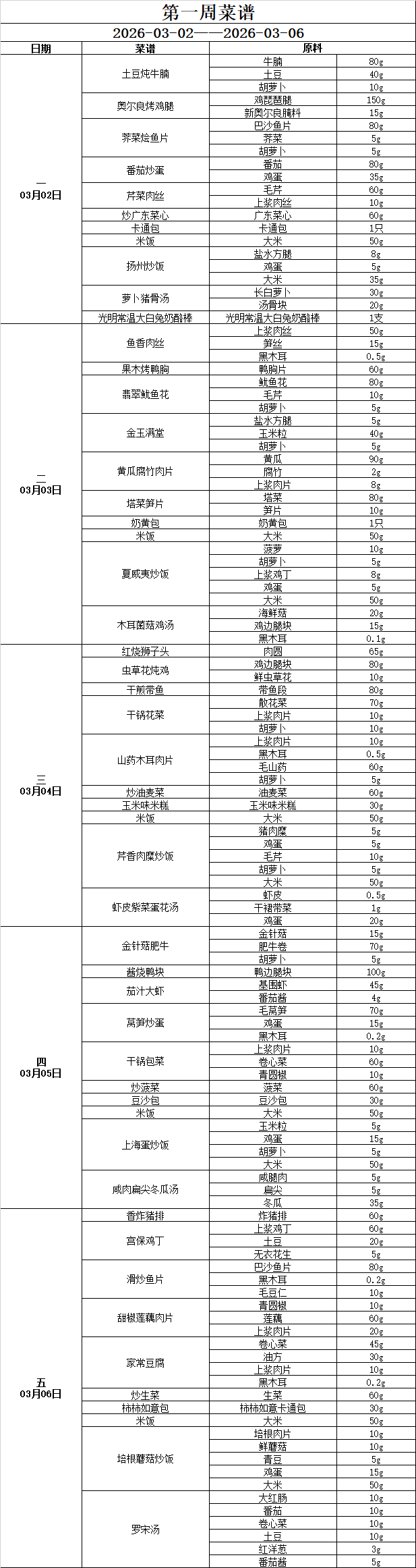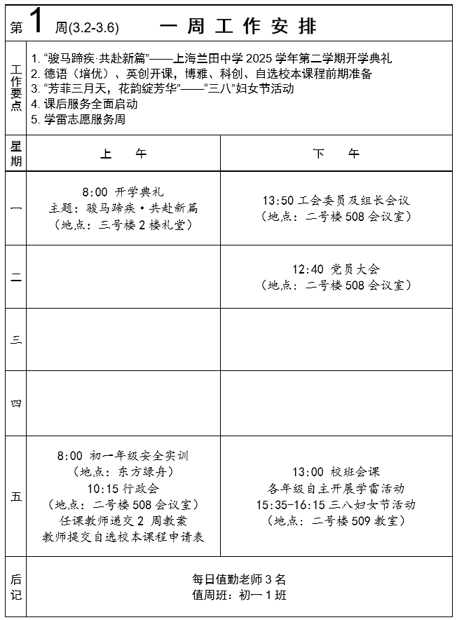 2025-2-1 一周工作安排及学生菜谱
