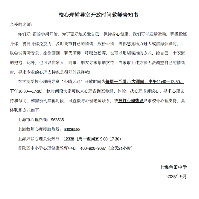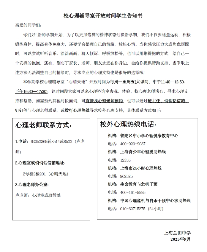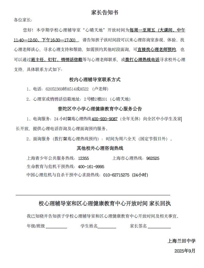 2025学年第一学期校心理辅导室和区心理辅导中心开放时间 告学生书&告家长书&告教师书